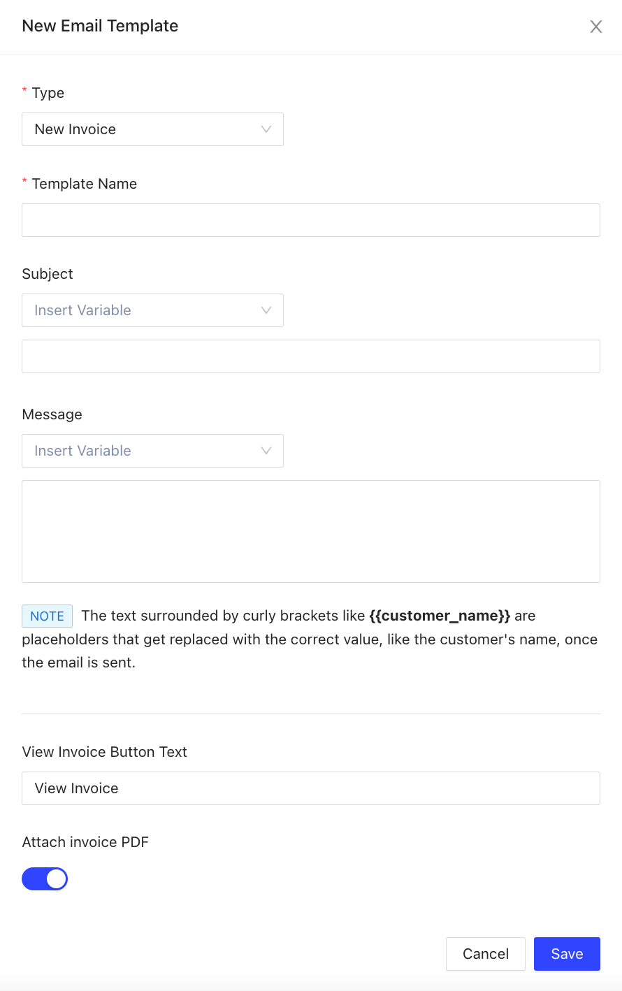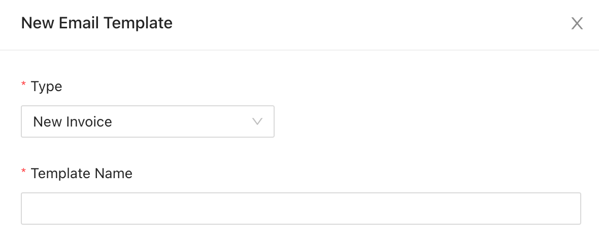 The first box you will see is “Type” Which is a drop down box with many options to chose from to create a template for. THe major categories are : Invoice, Credit Note, Quote, Statement, Subscription, Payment, Payment Plan, Chasing. Please choose which template you like to create and then got to “Template Name” to give a specific name to the template you are creating.