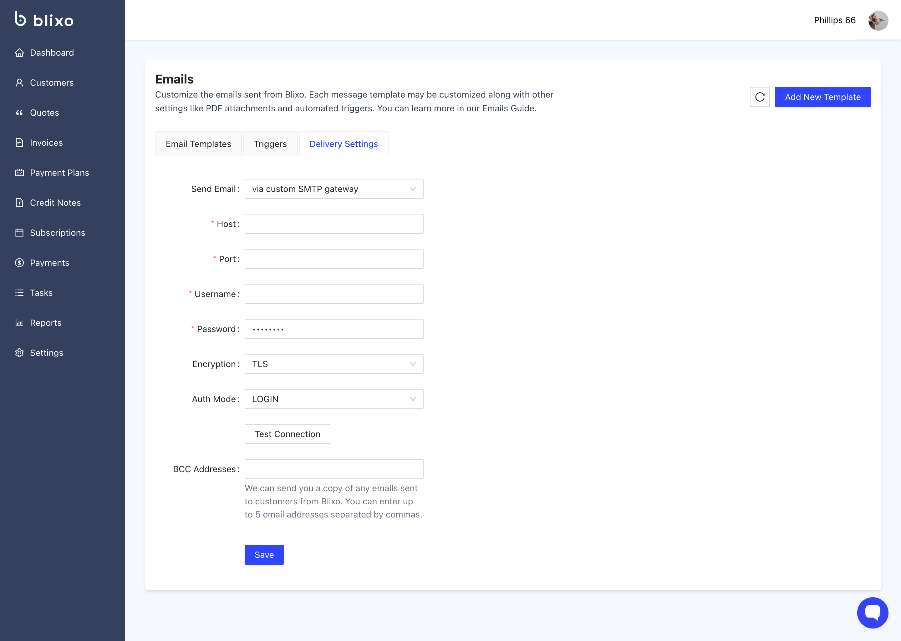 Here you can send an email using Blixo’s default email [no-reply@blixo.com] Or you can use your own by choosing “via custom SMTP gateway”