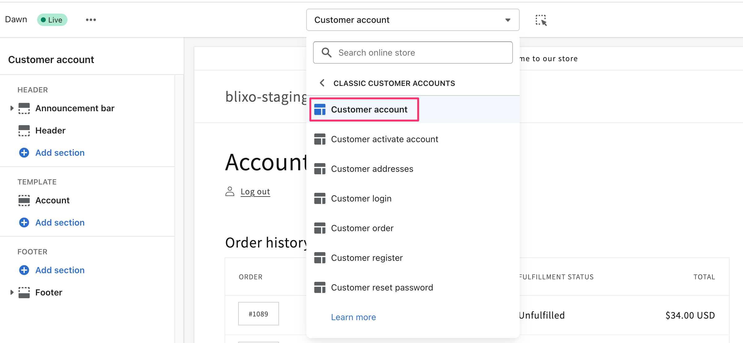 When you’re happy with the position of the block, click “Save” on the top right, the link will be added to your customer account page.