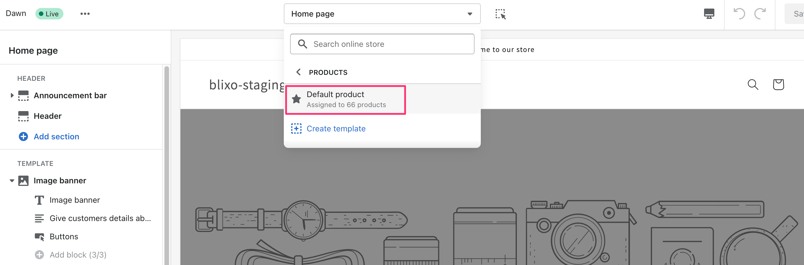 Visit the Shopify editor page. In the header, choose Products → Default product on the select. The login can be required.