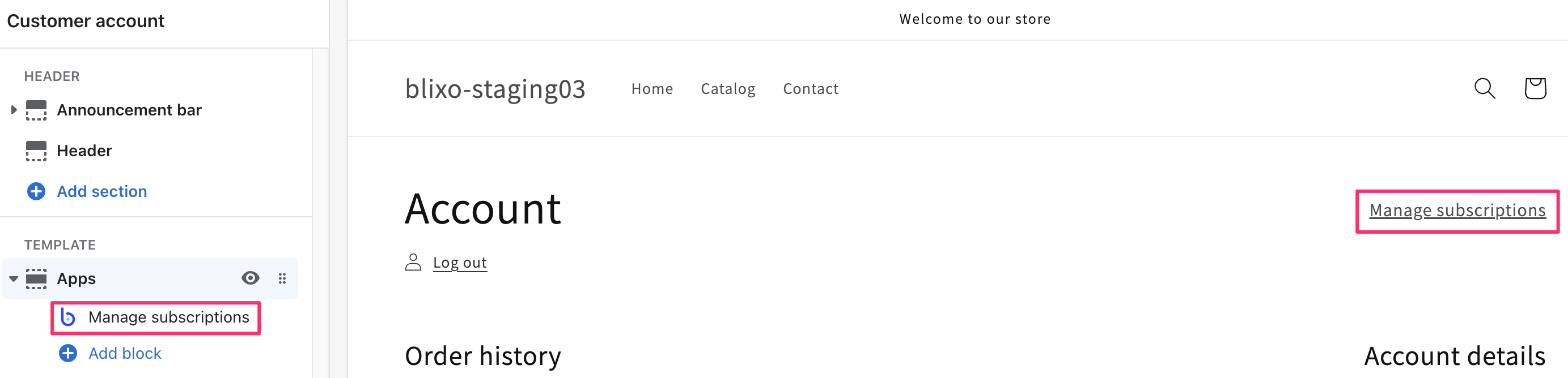 Drag the manage subscriptions link app block where you want it to appear on the account page. You can preview the position of the block on the right