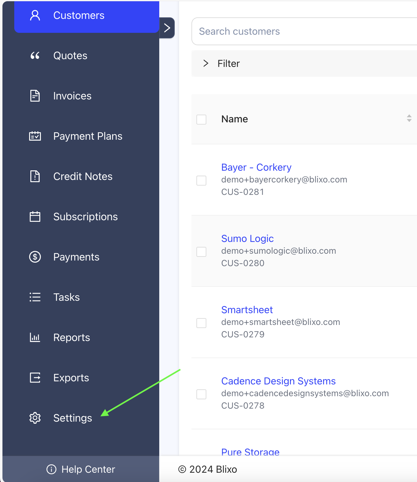 There are two ways to set up multi-currency on Blixo. The first way is to go to the Company Profile directly via the profile image. And the second way is to go to the Settings section in the sidebar.