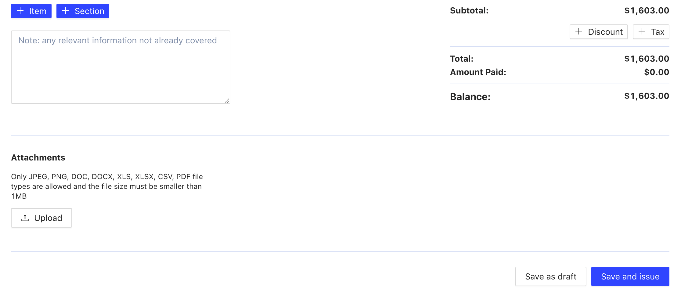 Once you done with the line items you can then add tax and discounts, as well as add any attachments ,