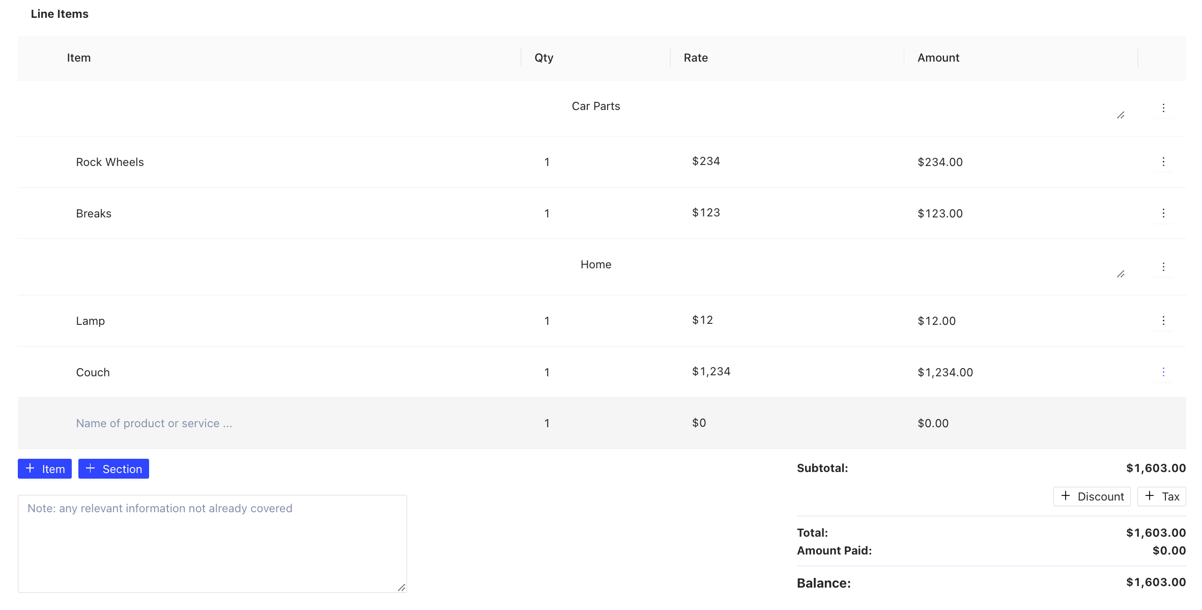 Here you can add items / services , quantity and cost, and you can also categorize them into sections