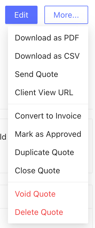 You will then be given the option to Download the Quote as a PDF, or a CSV file. You can choose the send button to send the quote, View the quote as the client would see it, Convert it to an Invoice, Approve the quote, Duplicate the quote, close the quote, and void or delete the quote.