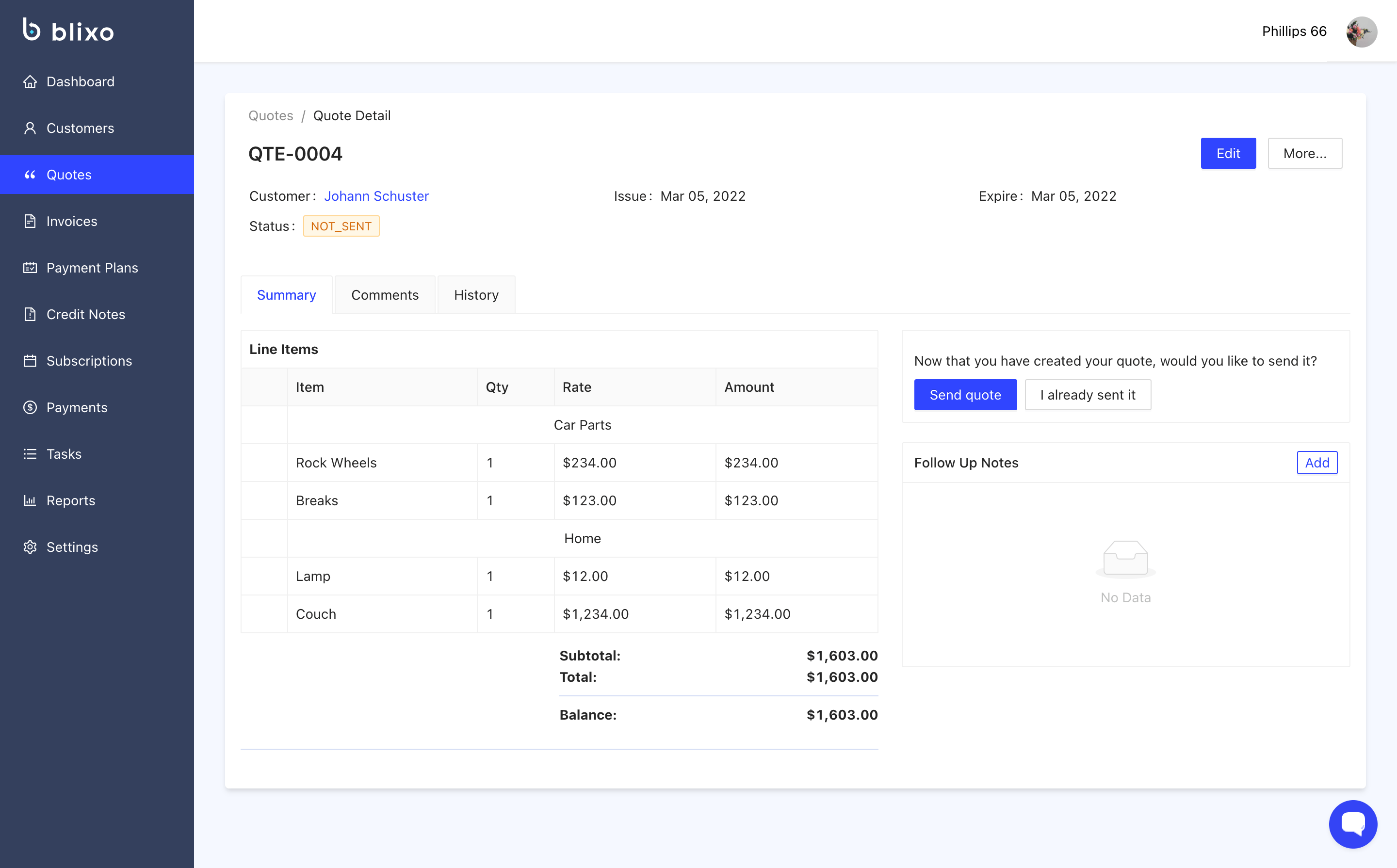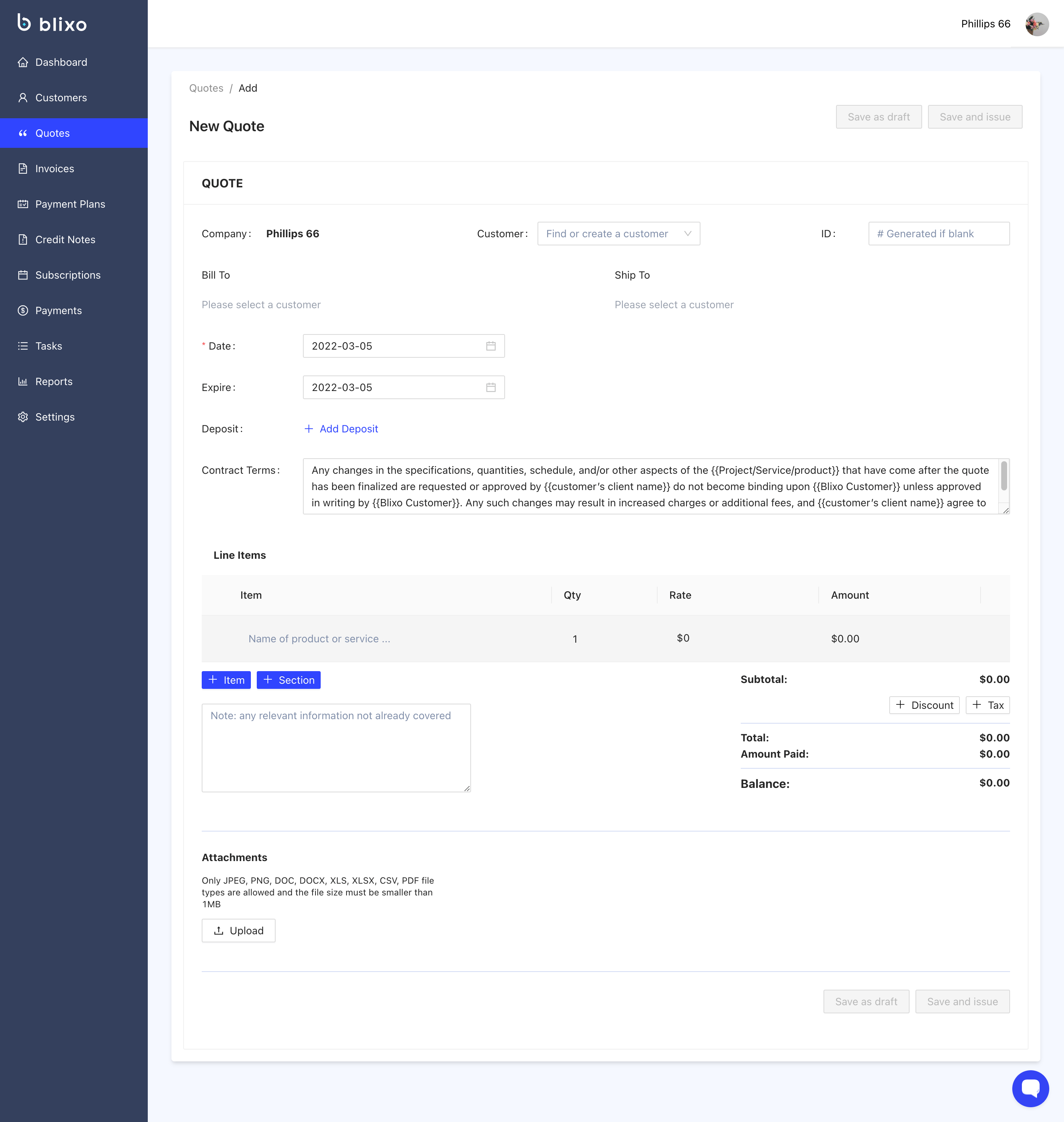 In Blixo quotes can easily be sent to customers. When a customer views a quote they can accept the terms of your legal agreement on Blixo. Then Blixo automatically converts the quote into an invoice that they can pay. Blixo supports different payment terms including deposits, prepaid retainers, and NET 30 arrangements.