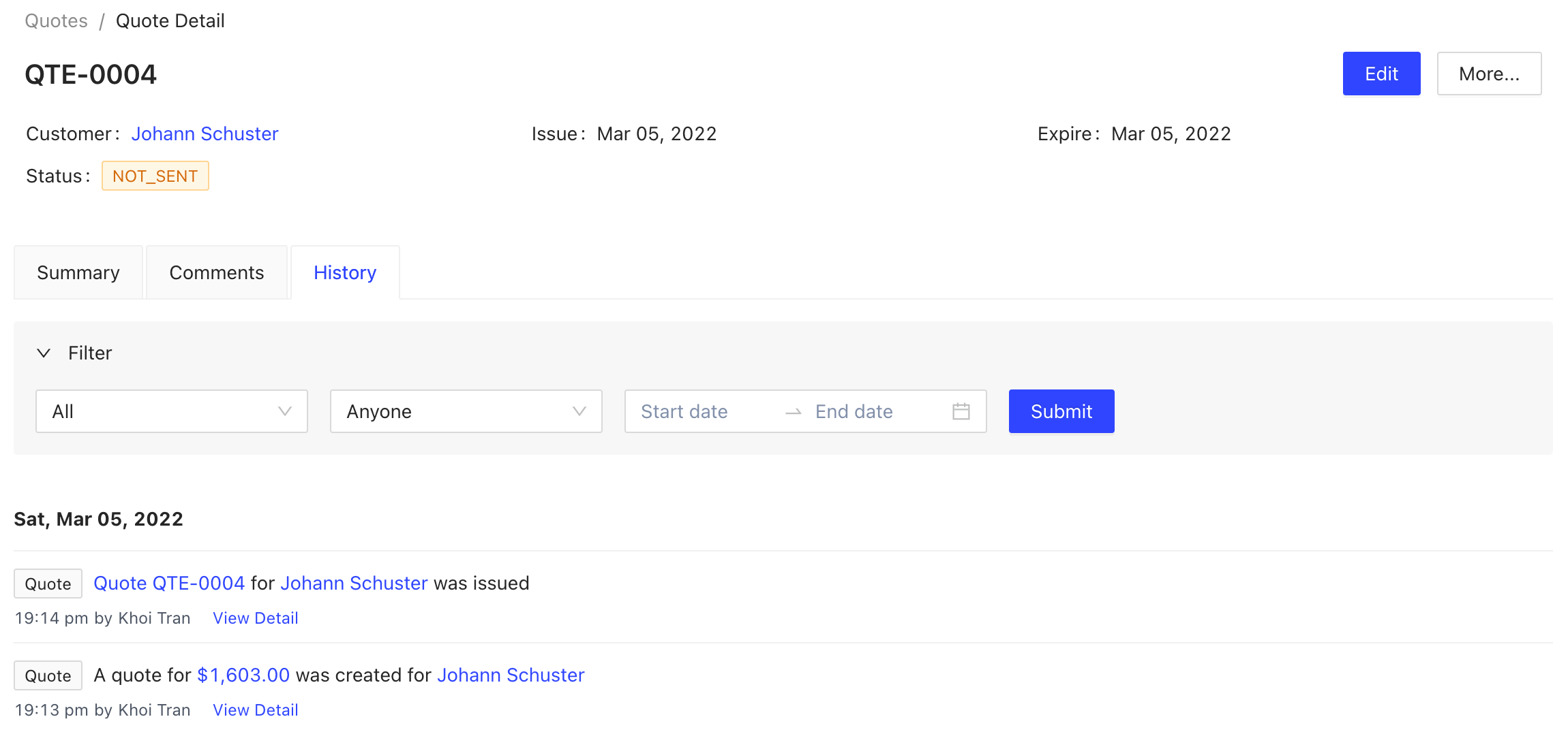 And under History: you will be able to see the edit history of the quote Another section are the tabs