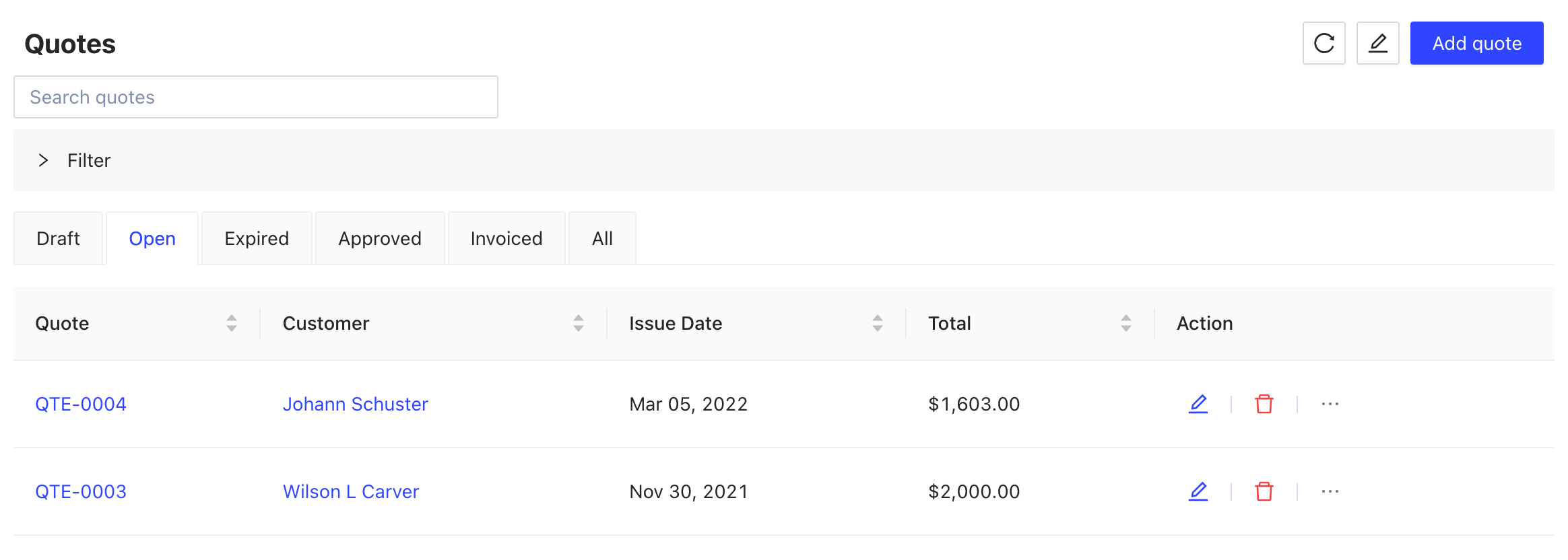 Depending on the status of the quote, they will be listed under the respective tabs: