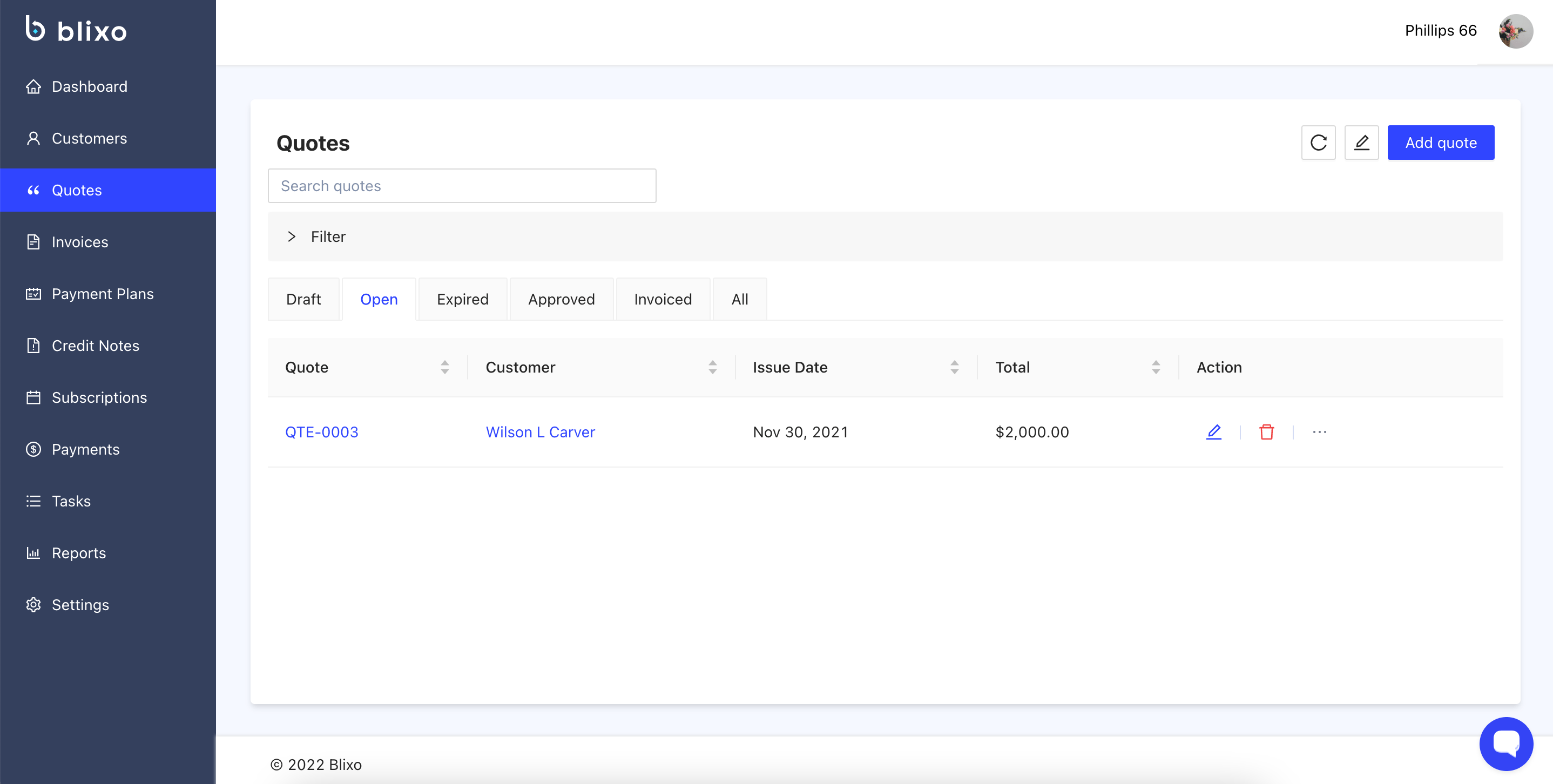 To get to Quotes, you can use the Blixo Sidebar and click on the Quotes section. Once you have clicked it will bring you to a page like this one below.