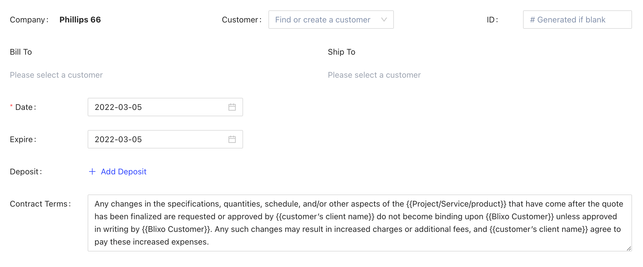 At the top half of the page you can choose the customer, add an ID if one is associated with the customer, set the date, expiration date, and if the customer gave a deposit that can also be entered here, and there is a section to enter contract terms if needed. There is a “Ship to” option if the ship to address is different from the billing address.