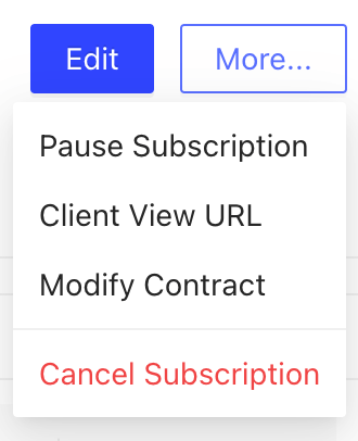 By clicking on “Edit” you can change what you need in terms of the subscriptions, Or you can click “More” for a dropdown menu to: Pause the subscription, To view the URL as your client, To make changes to the contract or to Cancel the subscription.