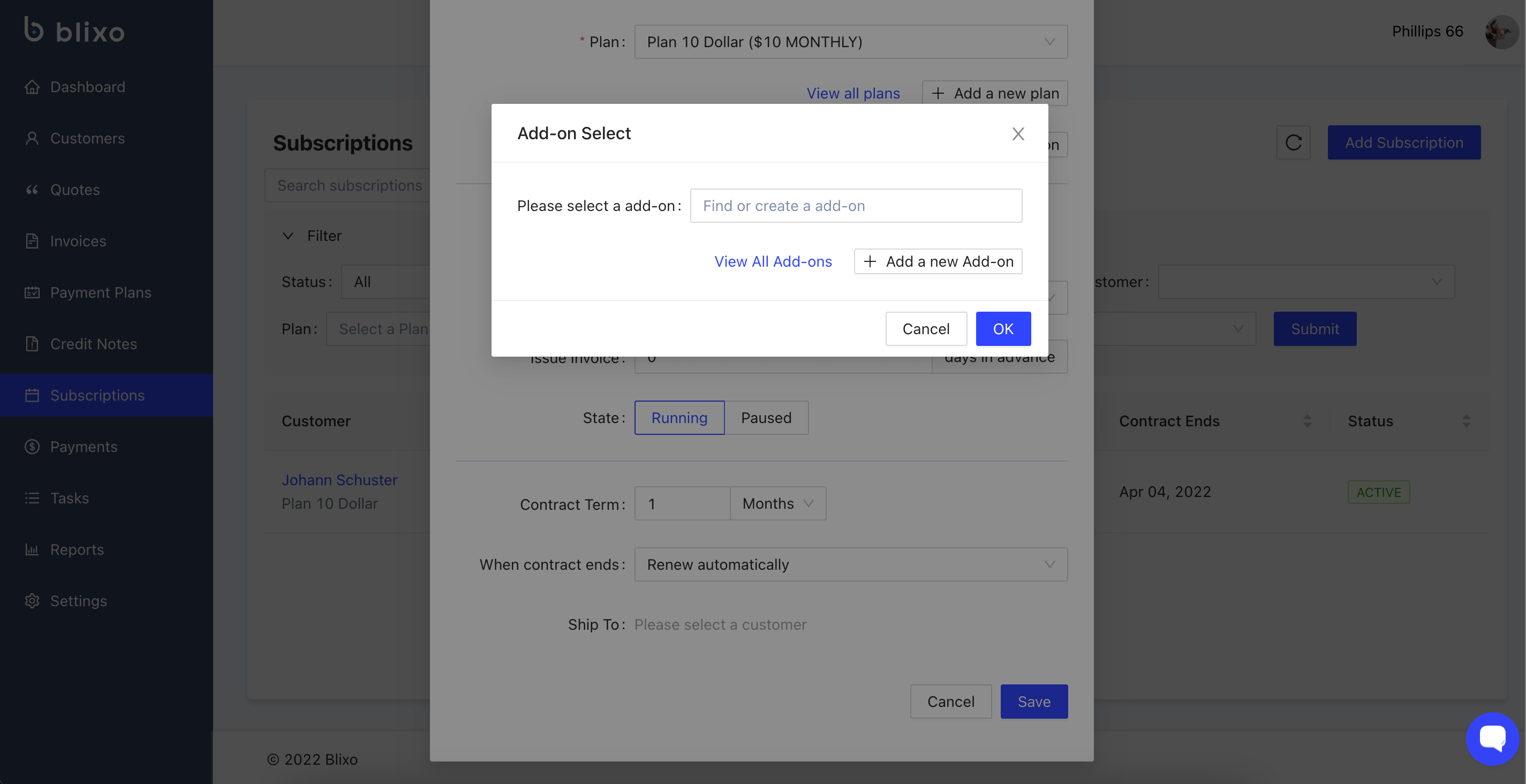Here you can choose which customer (list is from your previous entered Customers) and then either choose a subscription plan from the “Plan” drop down menu or create a new plan by clicking on “+Add a new Plan”
