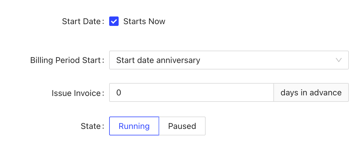 In this section you can choose when to start billing, what day of the month will the recurring invoice be sent out, and the option to pause or continue billing.